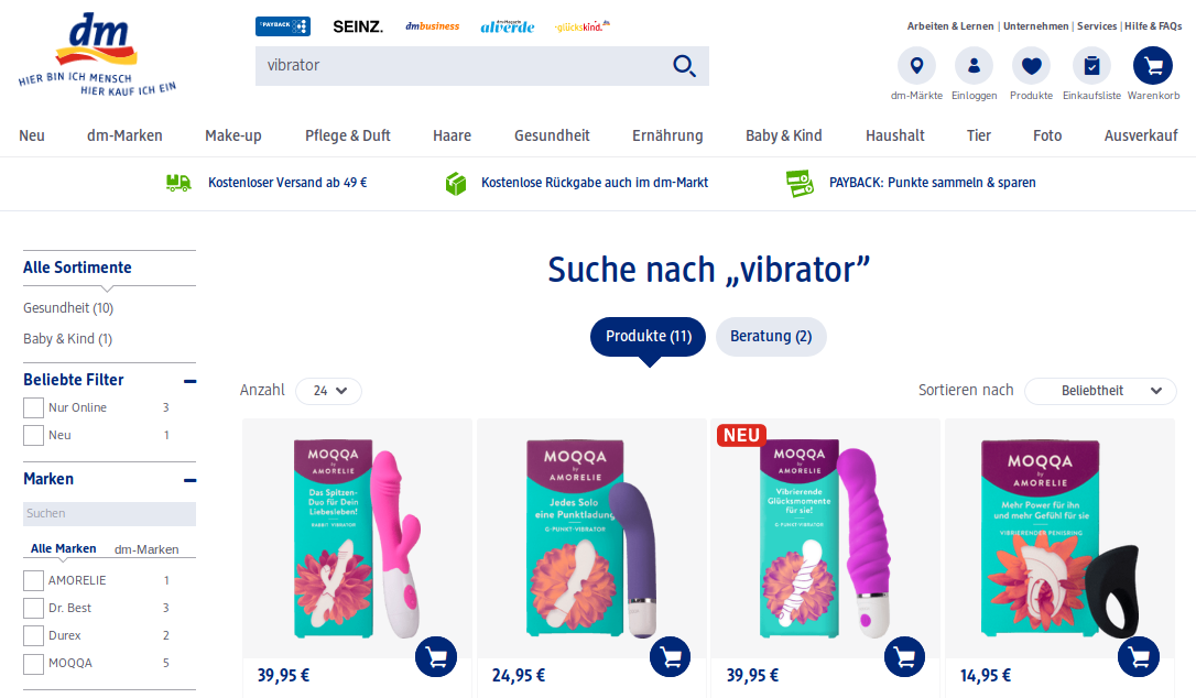 Gerade vorhin war ich mal wieder einkaufen in einem DM Drogeriemarkt. Gewohnt bin ich als Mann deren Orientierung an eine überwiegend weibliche Kundschaft, und so war ich auch dieses Mal der einzige Mann unter einem dutzend Frauen zwischen den Regalen, zwei davon sogar mit Kind. So lange ich bekomme was ich will ist mir das egal. Dann aber fiel mir etwas neues auf, das ich bislang noch nie dort sah und es ließ mich kurz innehalten: Bei DM kann man - oder eher frau - neuerdings Vibratoren kaufen. Ja, richtig gelesen, Vibratoren im Sinne von Sexspielzeug. Ein Kommentar dazu.